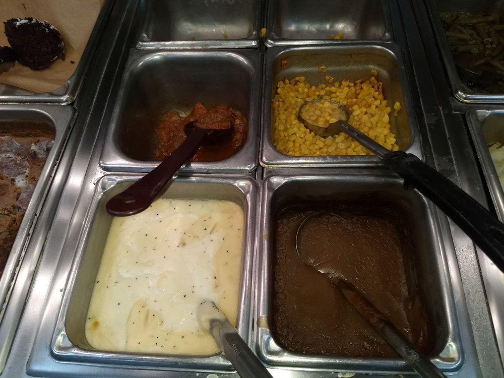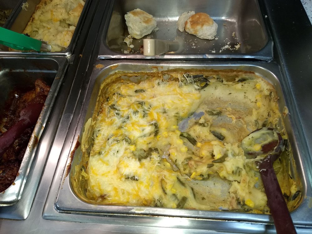 Includes mashed potatoes with gravy, sweet corn, and chicken nuggets, topped with a blend of three shredded cheeses. (590 cal.)