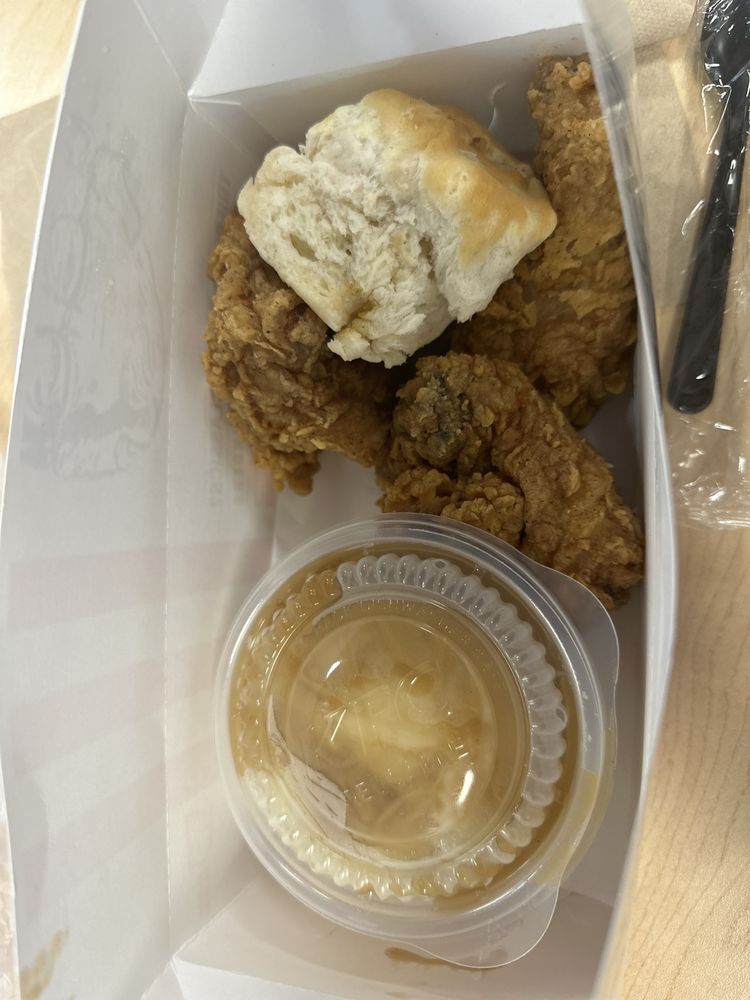 Includes 3 pieces of KFC's world famous fried chicken with Mike's Hot Honey sauce, choice of side, medium drink & biscuit. (1100-2180 cal.)